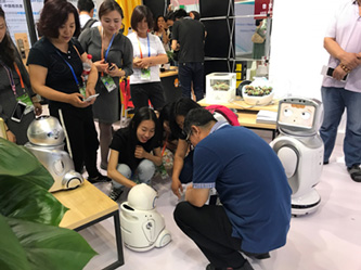 (图:第五届中国(北京)国际服务贸易交易会苏宁易购展区,智能机器人小勇正在与参观者互动)